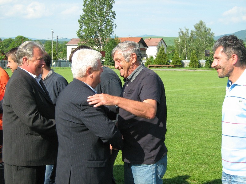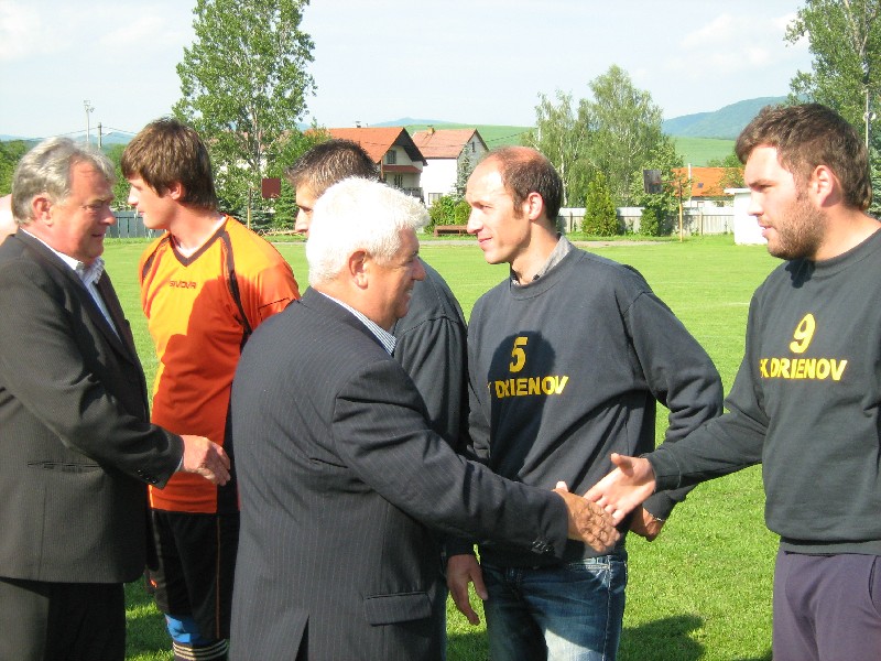 Futbalisti Drienova vyhrali s vysokým náskokom III. A triedu a postupujú do II. triedy. Pred zápasom Drienov - Dulová Ves im pohár odovzdáva predseda Oblastného futbalového zväzu Prešov Jozef Kriš.